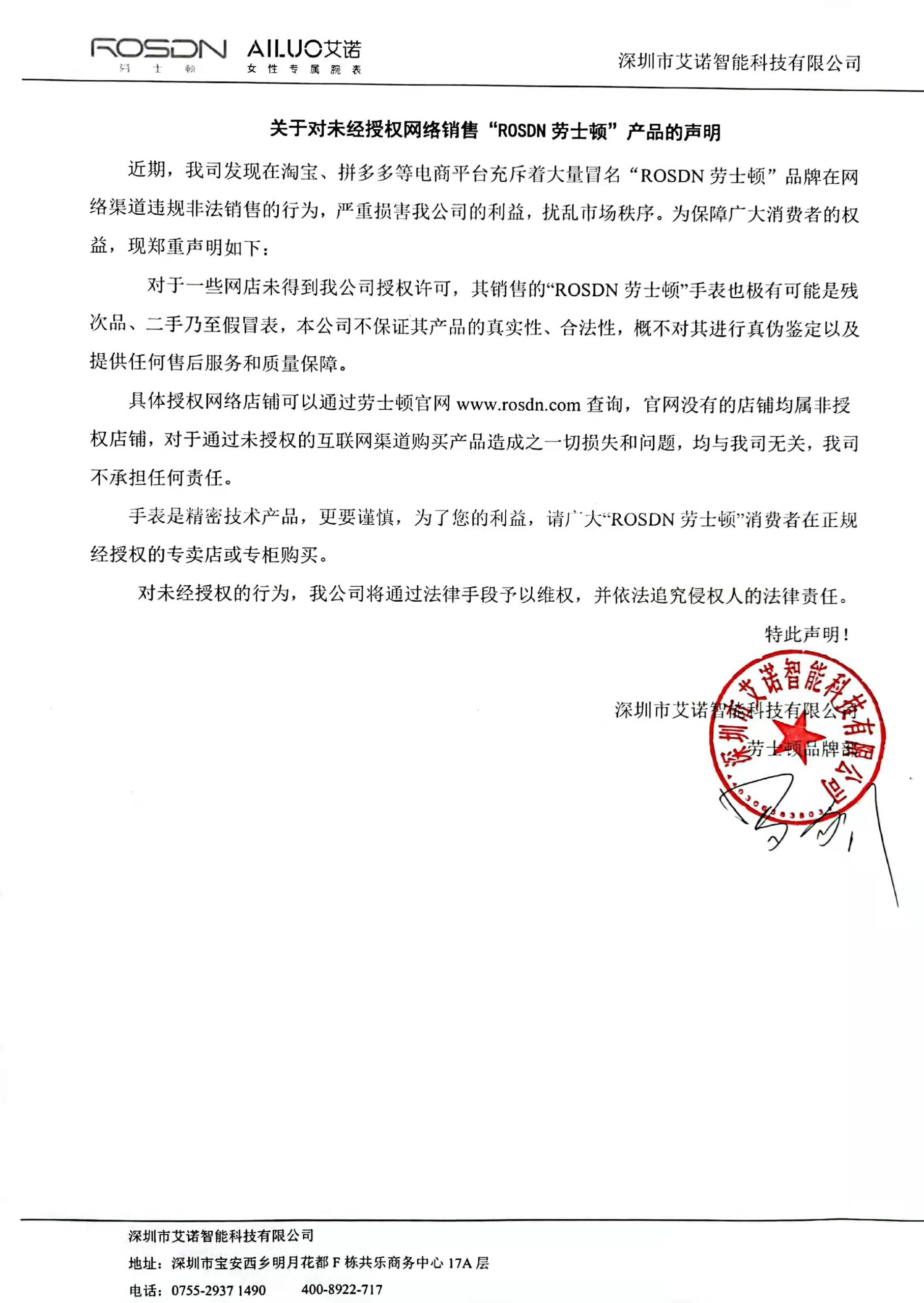 关于对未经授权网络销售“ROSDN劳士顿”产品的声明