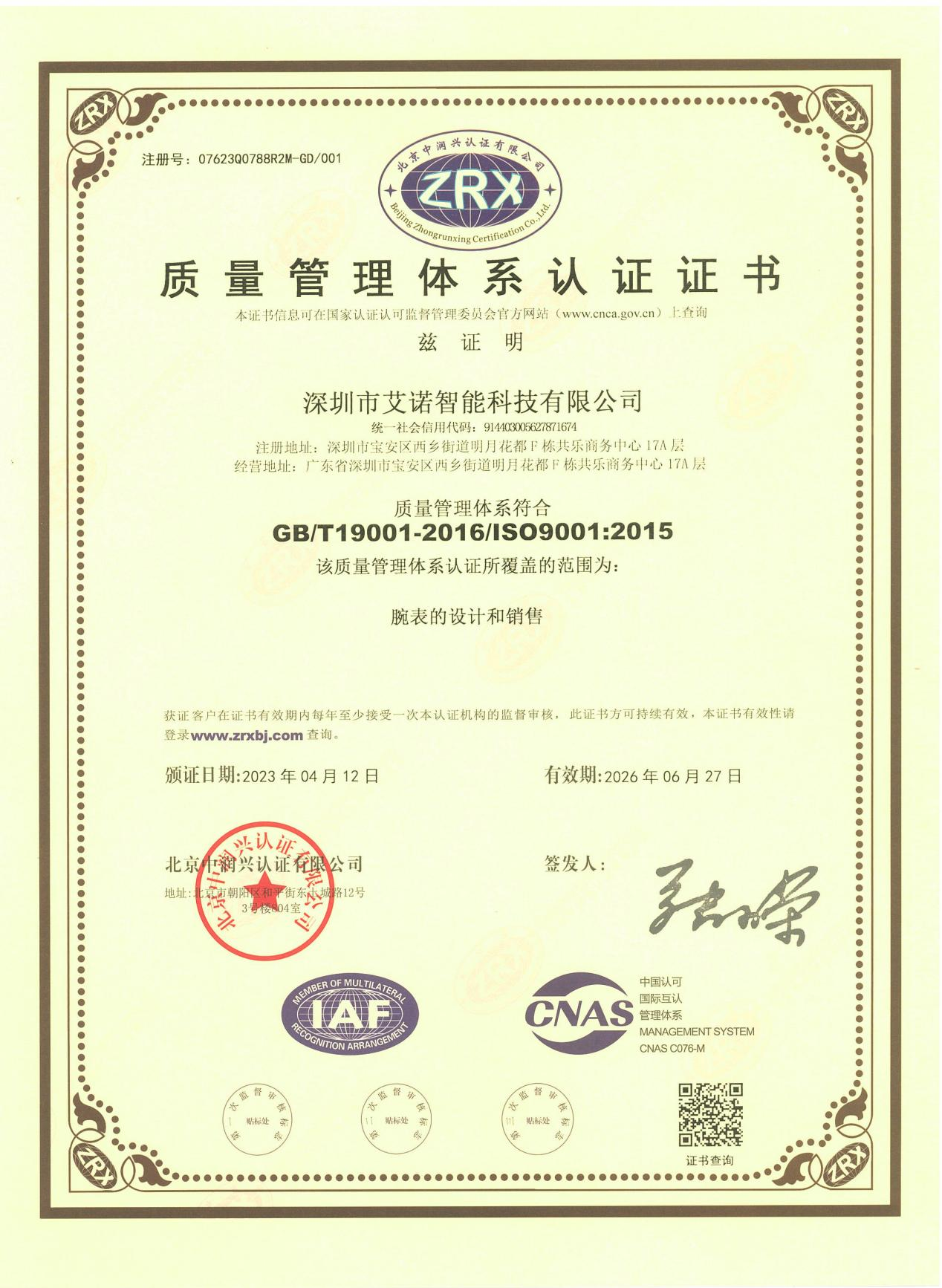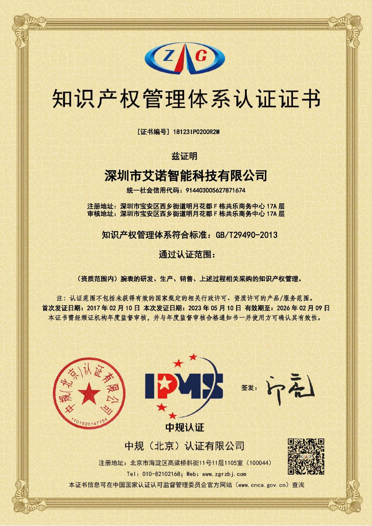 据悉该公司成立以来,一直秉承着品质至上的企业理念,不断创新,不断进取。本次荣获质量管理体系和知识产权认证双重认证,是对深圳市艾诺智能科技有限公司现有管理体系和产品质量的一种肯定,标志着深圳市艾诺智能科技有限公司已经具备持续生产和提供高品质、满足客户需求的腕表产品,并且在研发、生产和销售层面已达到国际标准。