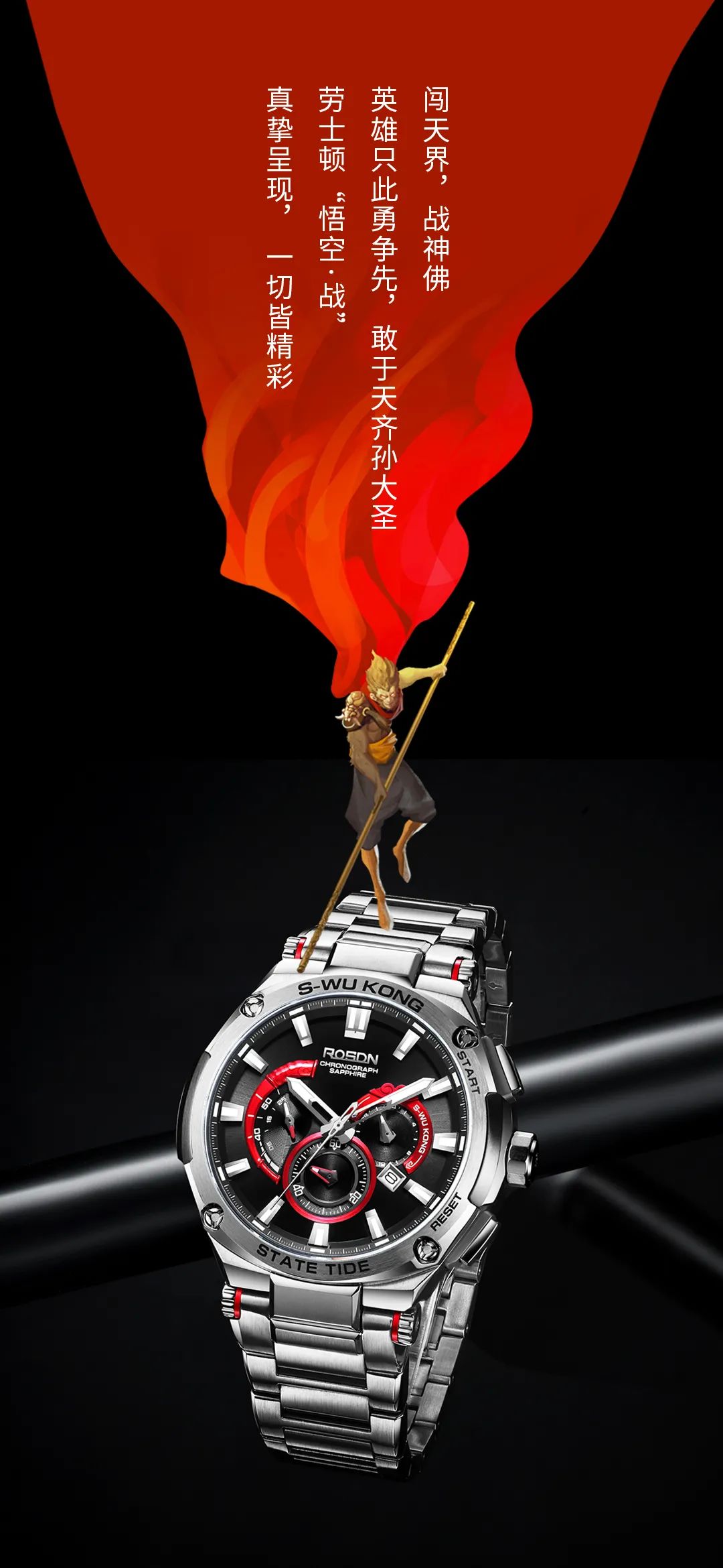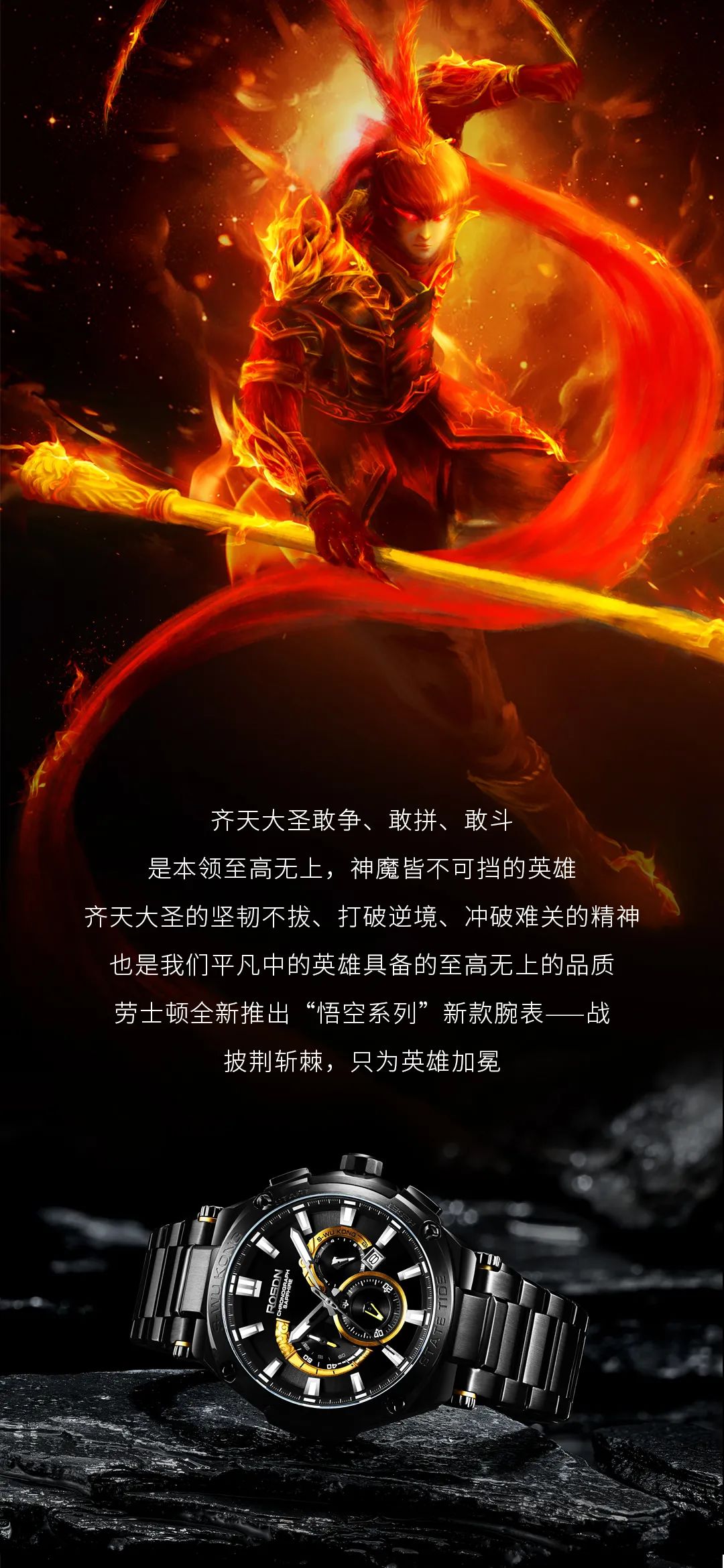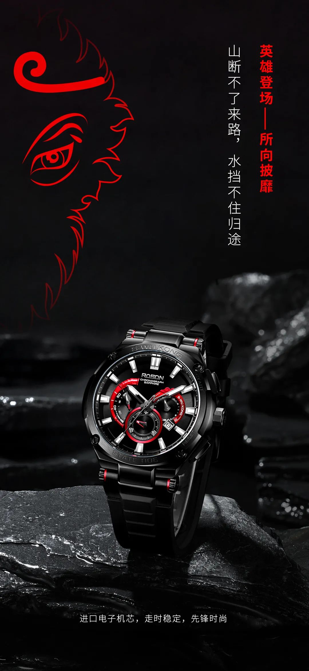 劳士顿表不仅在技术方面优化升级,对手表产品的外观设计、研发体系及创新意识也不断提高,劳士顿在满足年轻一代对手表个性、时尚、酷的追求的同时,把中国传统文化融入手表设计中,劳士顿悟空系列腕表就是把国潮文化与现代科技高度融合的先锋代表。真正的做到了年轻、国潮、酷融为一体,在佩戴手表的同时也是在宣扬祖国传统文化。