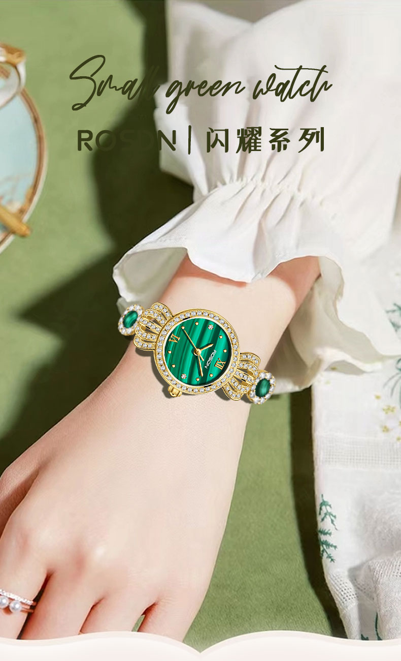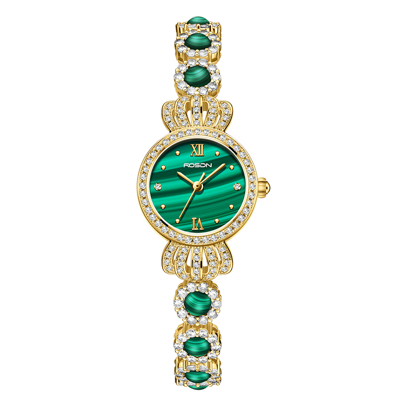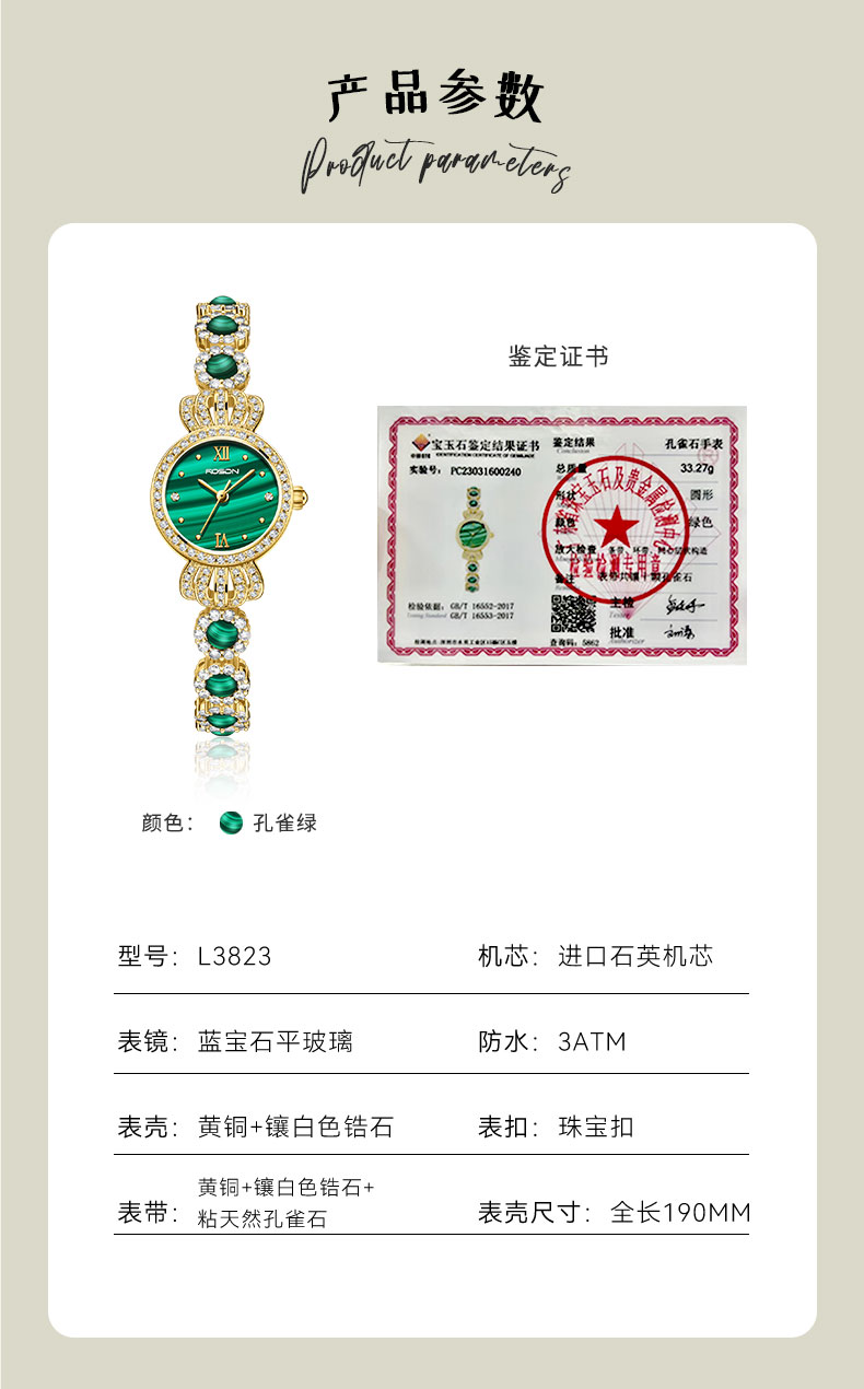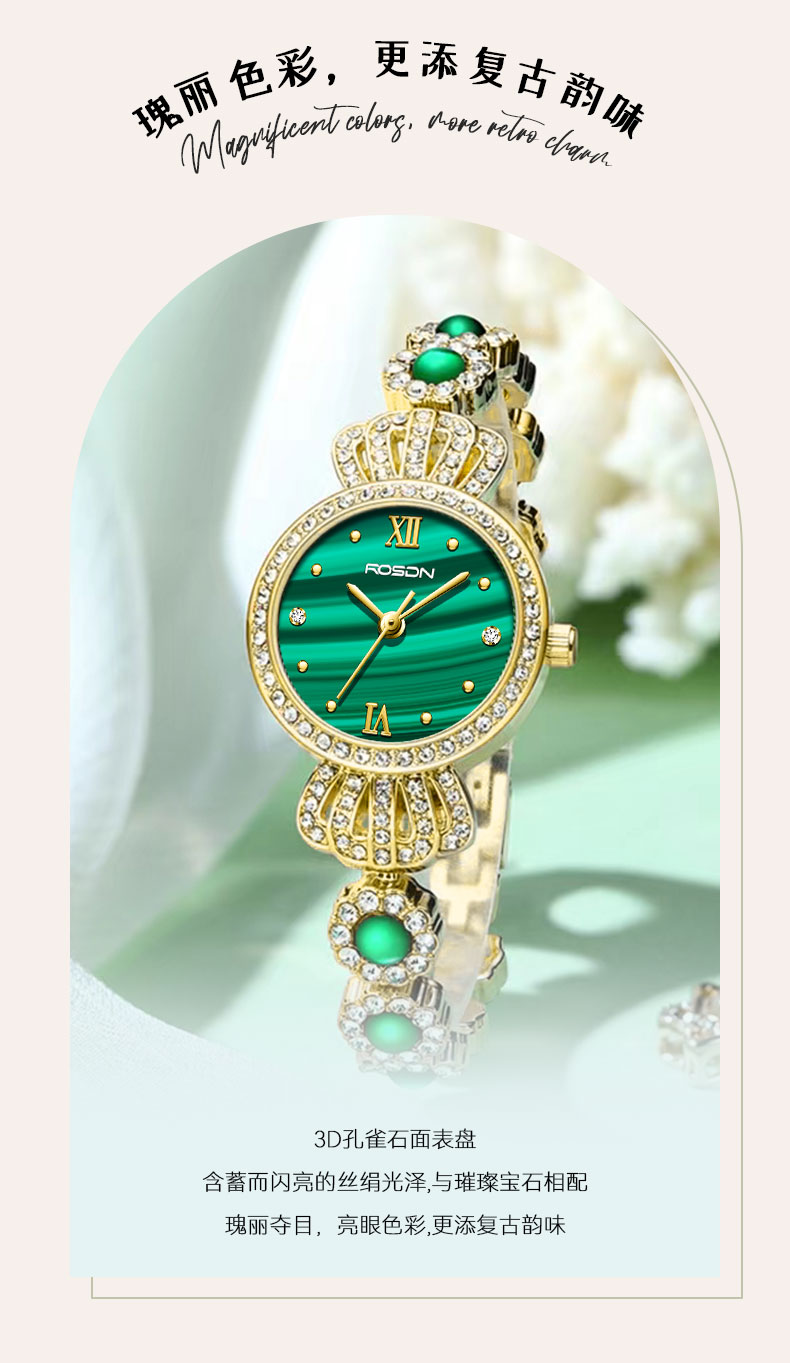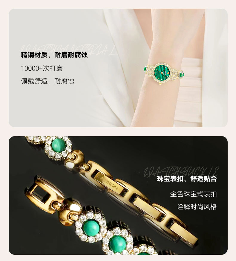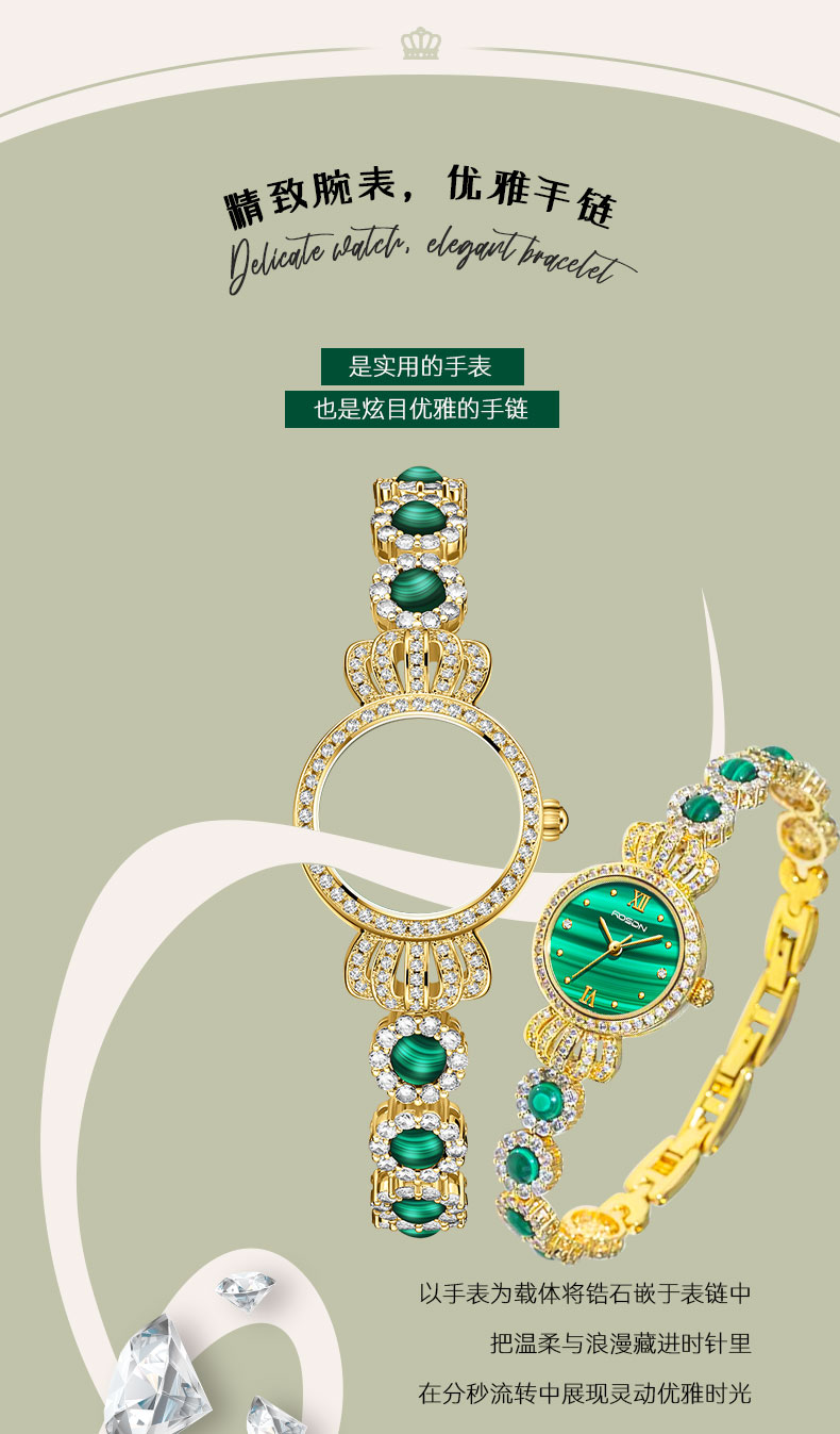 表带:黄铜+镶白色锆石+粘天然孔雀石