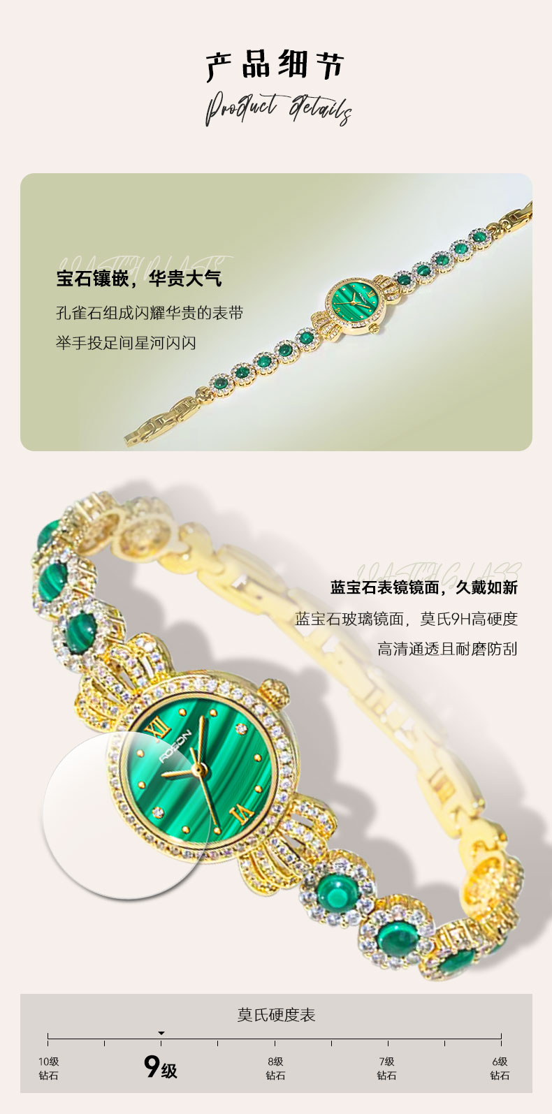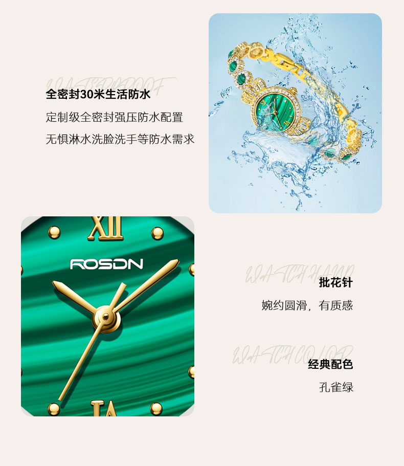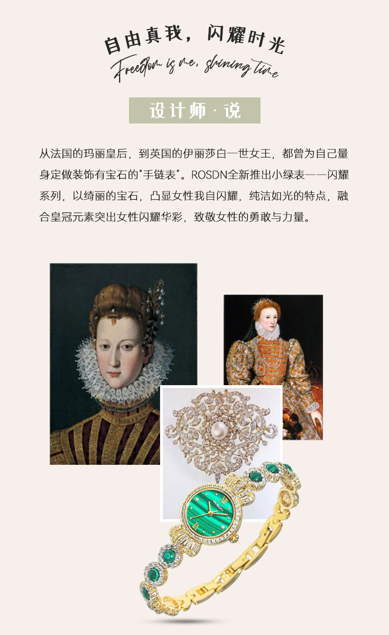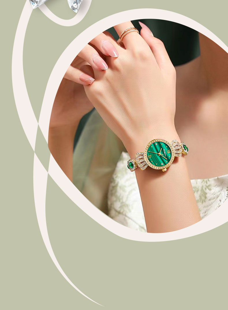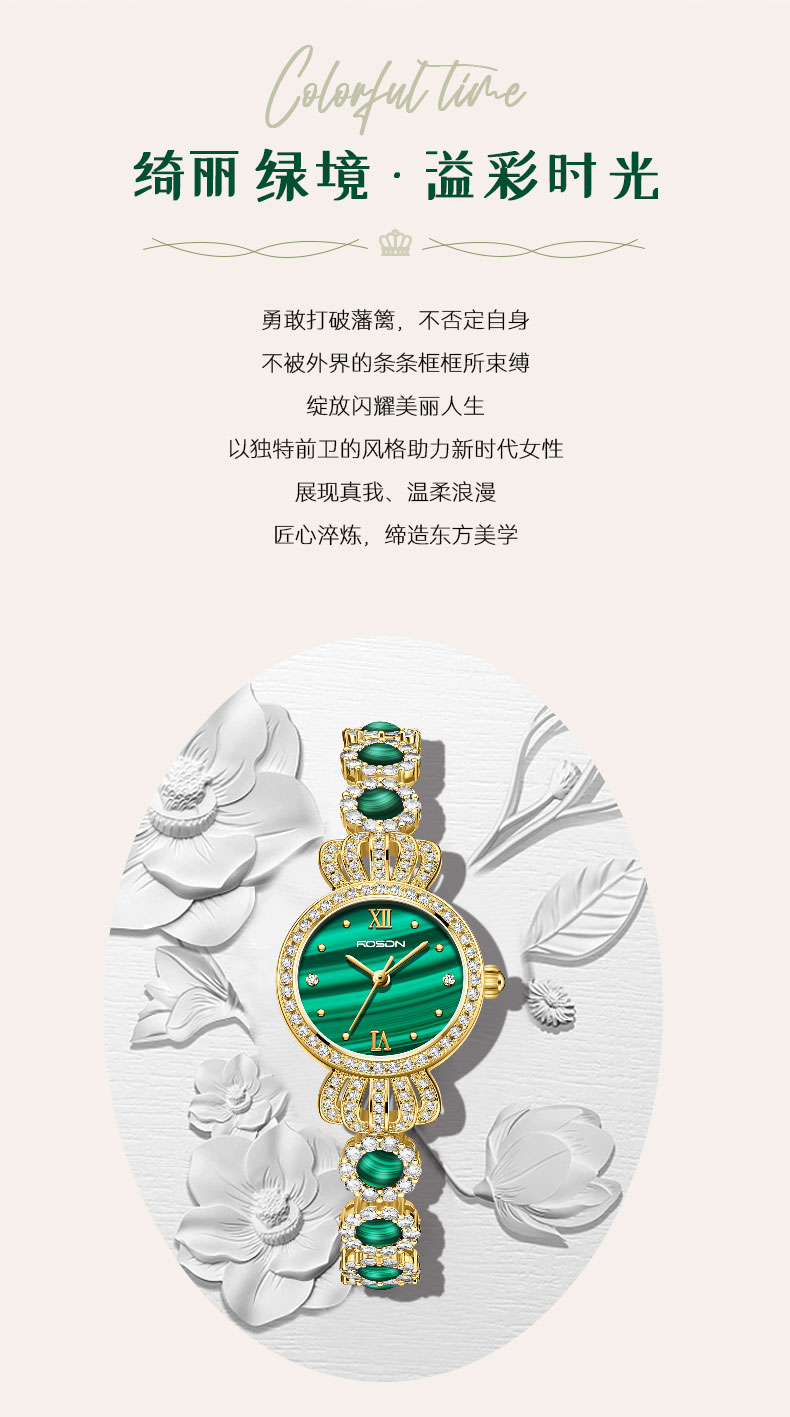 表带:黄铜+镶白色锆石+粘天然孔雀石